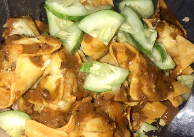 Celupkan adonan batagor yang dilapisi kulit pangsit tadi ke dalam telur. Ambil 12 sendok adonan. Selanjutnya batagor disajikan dengan siraman sambal kacang.
